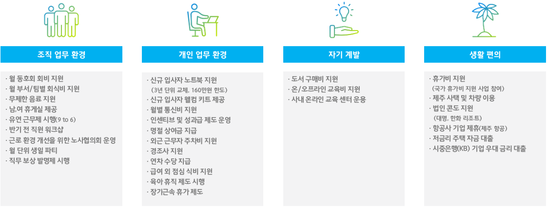 신시웨이에는 이외에도 직원들을 생각하는 다양한 복지제도를 시행하고 있습니다. 대표적으로 신규 입사자에게 160만원 한도 내에서 노트북 지원, 직원들의 고충 해결을 위한 노사협의회 운영, 장기근속 휴가제공, 유연근무제 시행, 자기계발비 지원 등이 있습니다.
